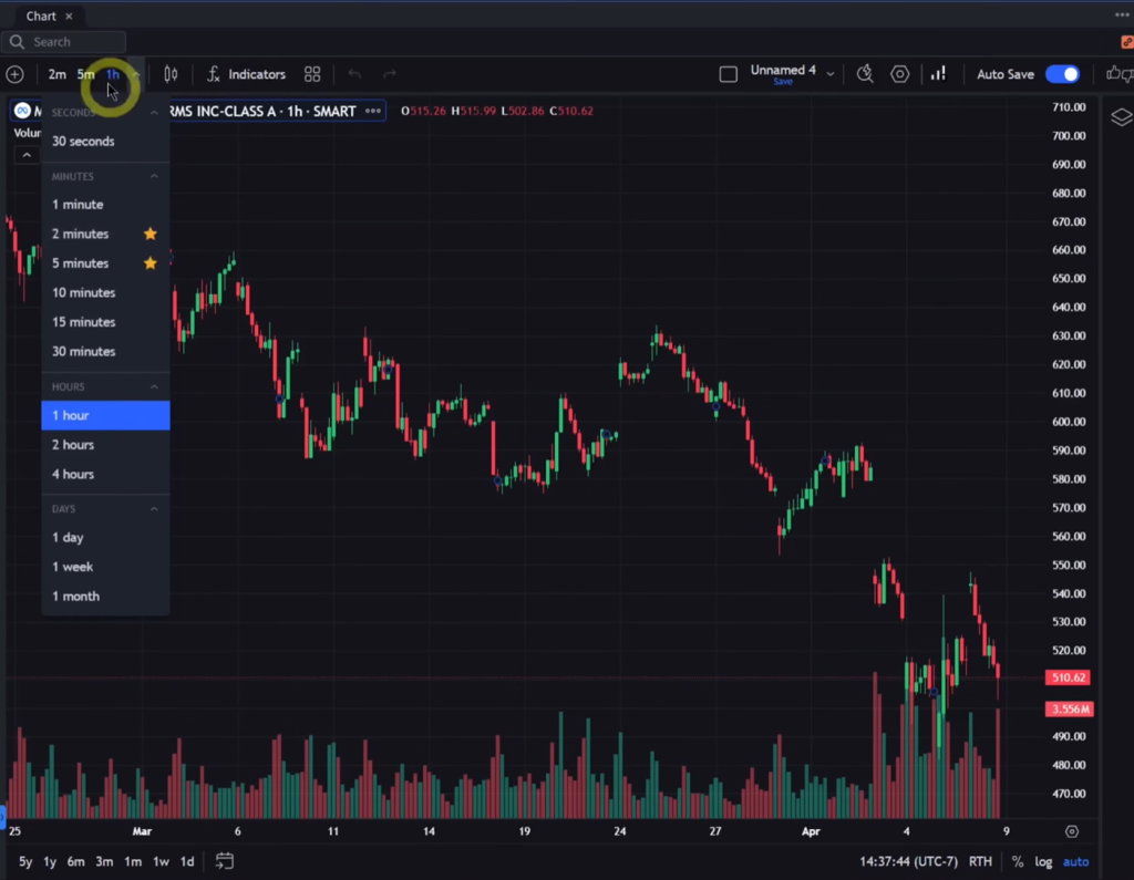 Change chart time frames by clicking the selector at the top of the chart. You’ve got options like five minute, two minute, one hour, daily, and so on.