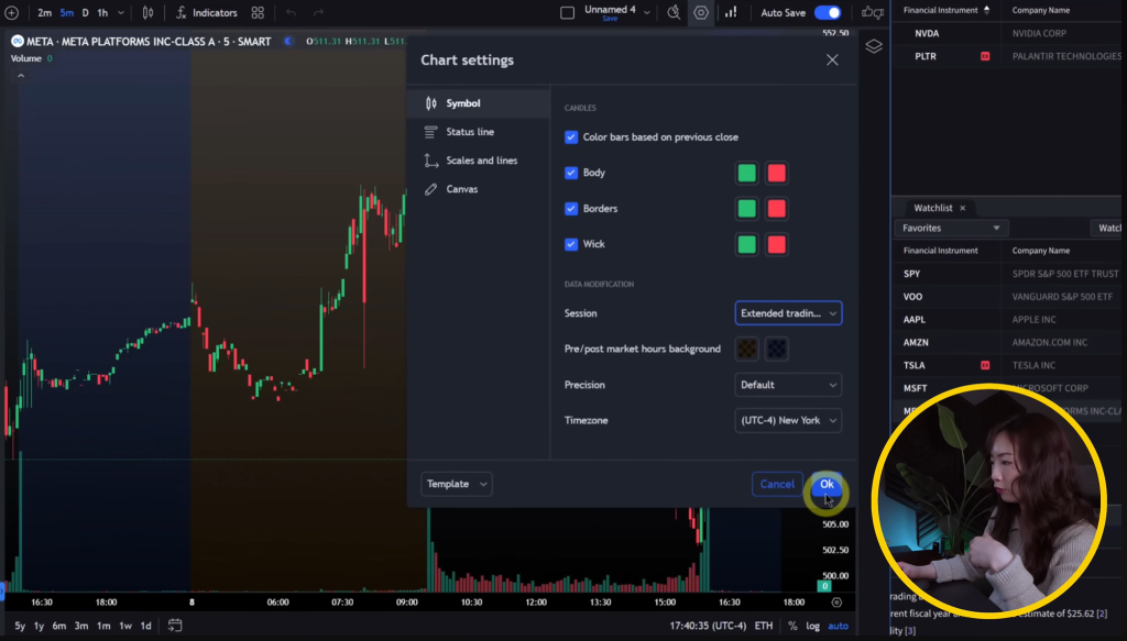 Head to chart settings, open the symbol tab, and turn on extended hours. Pre-market and after-hours prices will show up in different colors, so you can see what’s going on outside regular trading. It’s pretty useful if you’re watching movers before the bell or after close.